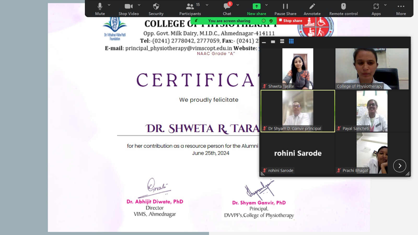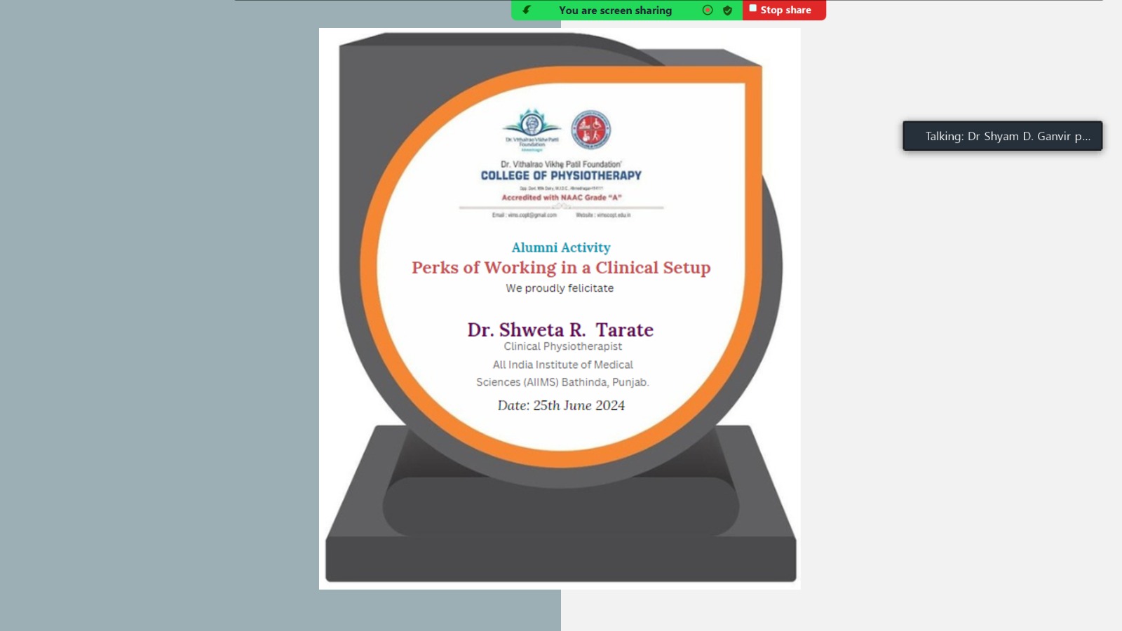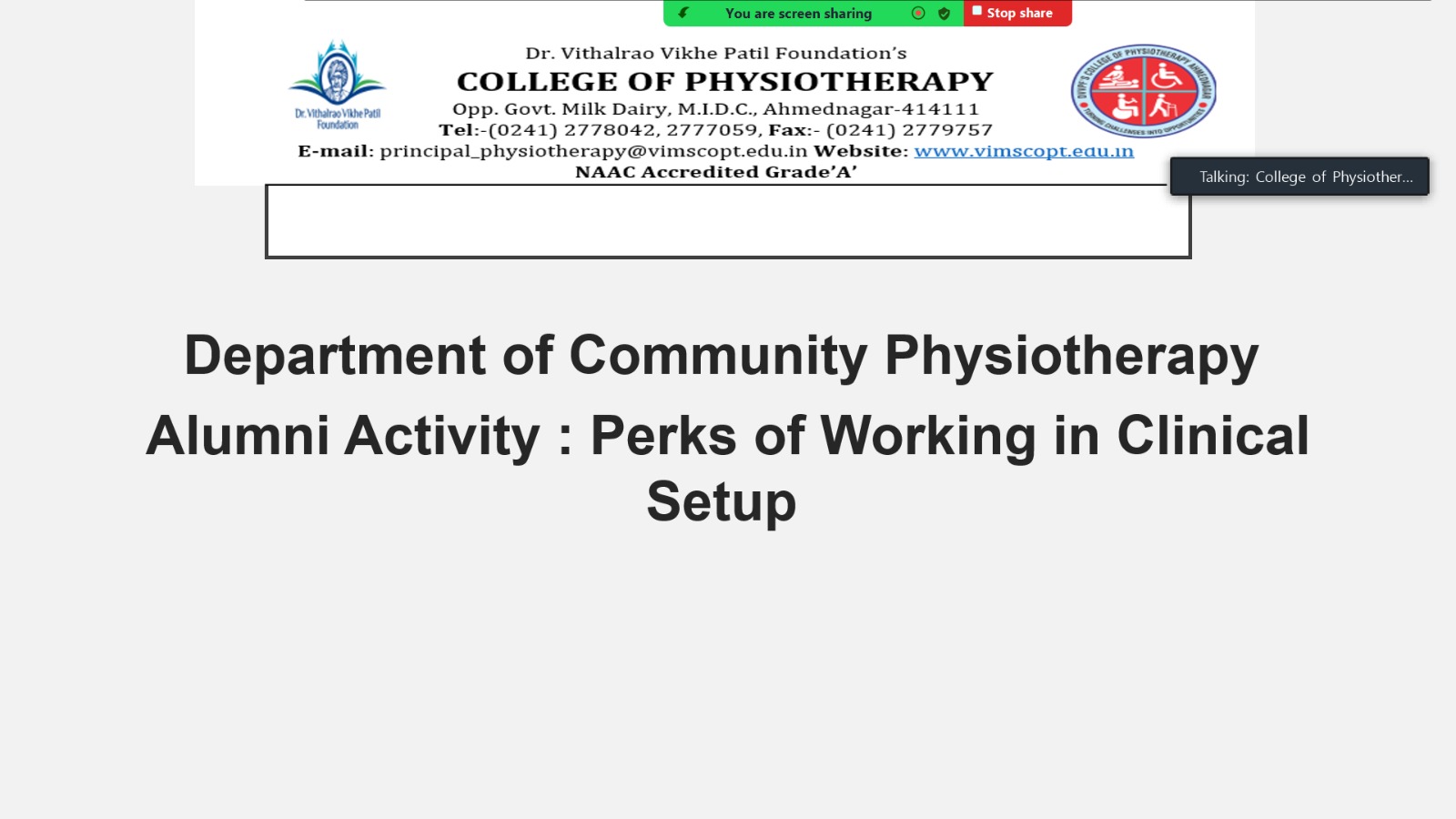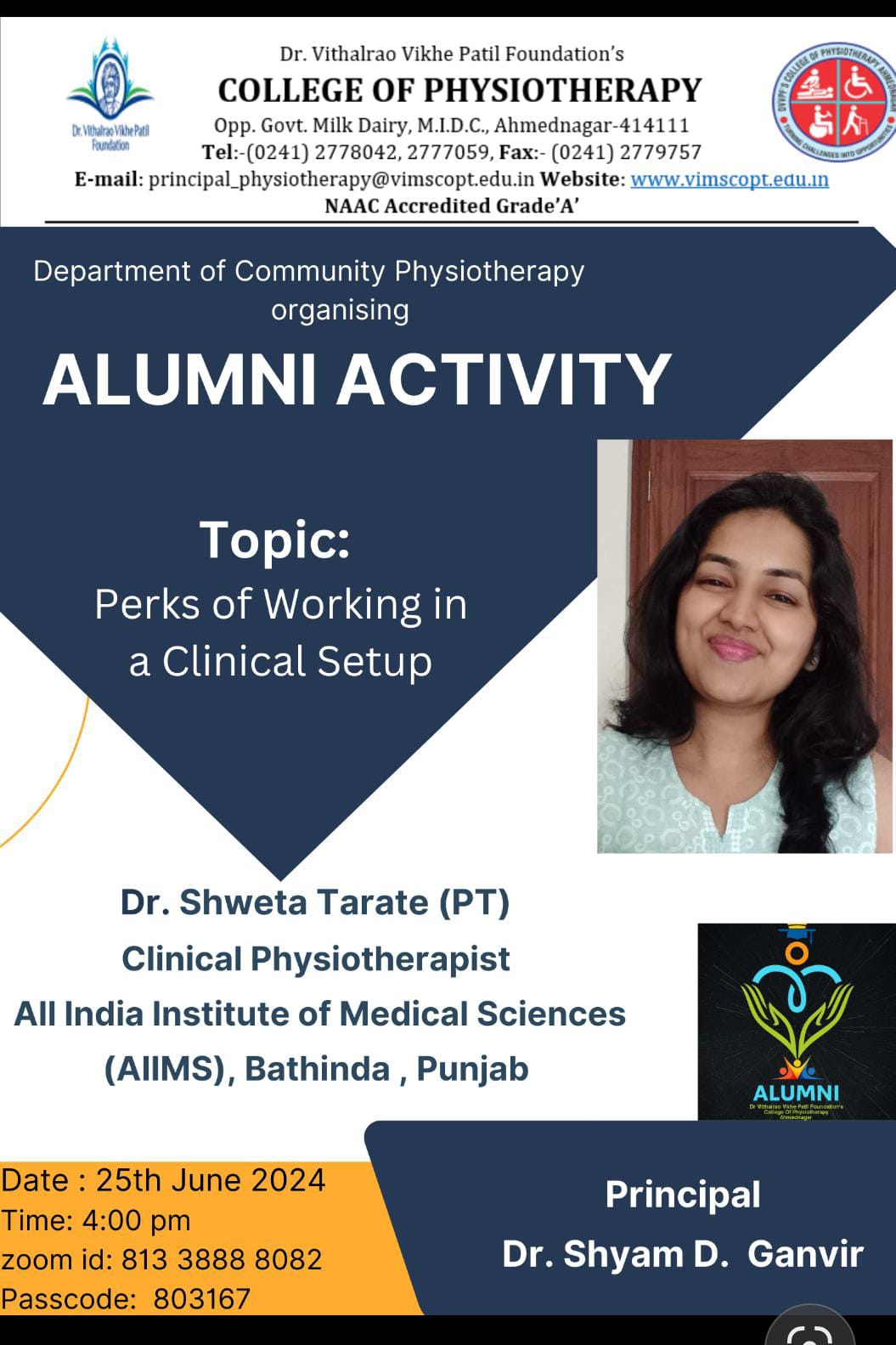 Department of Community Physiotherapy had conducted Alumni Activity on the topic: Perks of working in Clinical Setup on 25th June,24.The Speaker was Dr. Shweta R. Tarate(UG Alumni :2015 Batch). Her speech enligthened each and every student. Overall the Program proved frutiful to the students.