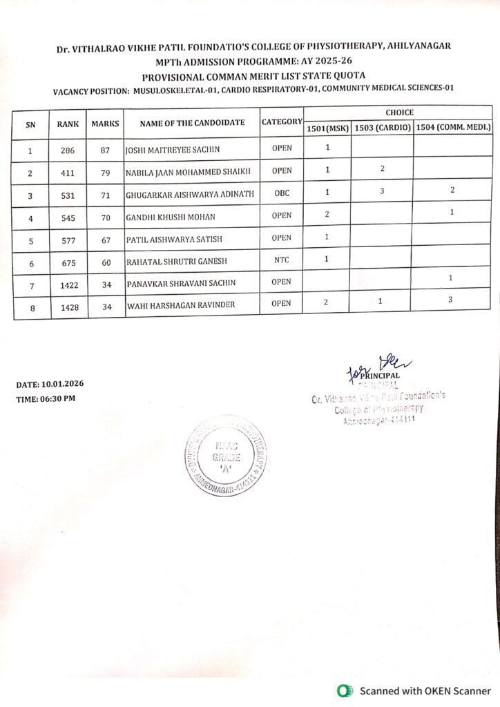 Common Merit List For MPT Vacancy round 10.01.2026